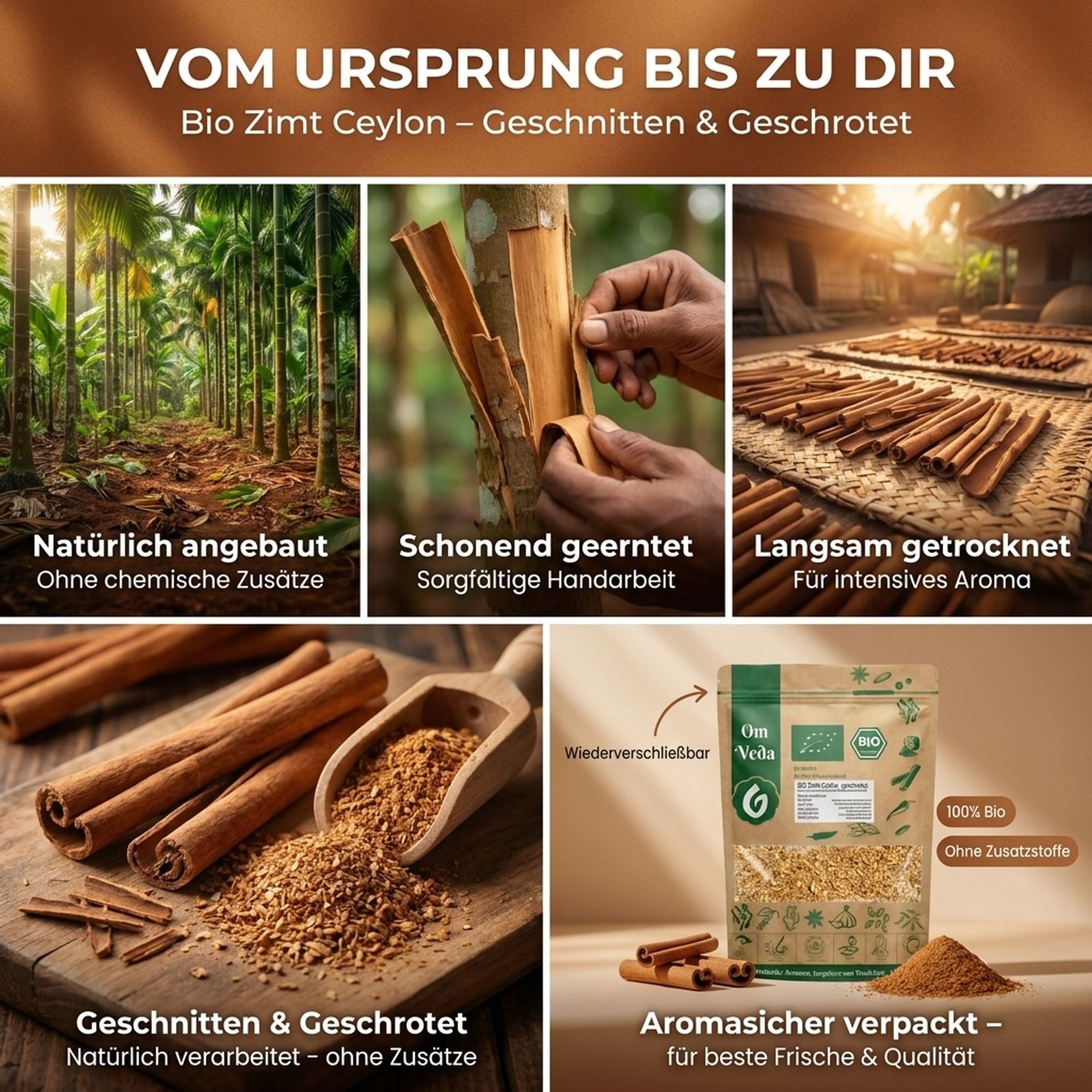 BIO Ceylon Zimtstücke mit fein-süßem, warmem Aroma und zarten blumigen sowie leicht zitrischen Noten – ideal für Tee, Chai, Punsch, Kompott, Desserts und ausgewählte herzhafte Gerichte.